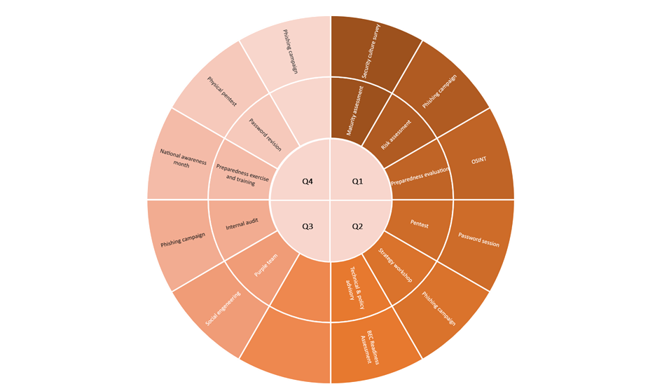 Cybersecurity is an ongoing and dynamic process, rather than a one-time implementation. Structured planning by identifying and organizing security activities throughout the year – customized for your business. This involves continuously monitoring and adapting to emerging threats, updating security measures and potential vulnerabilities. This can include security activities such as maturity- and risk assessments, periodic training and awareness sessions, vulnerability assessments and penetration tests.